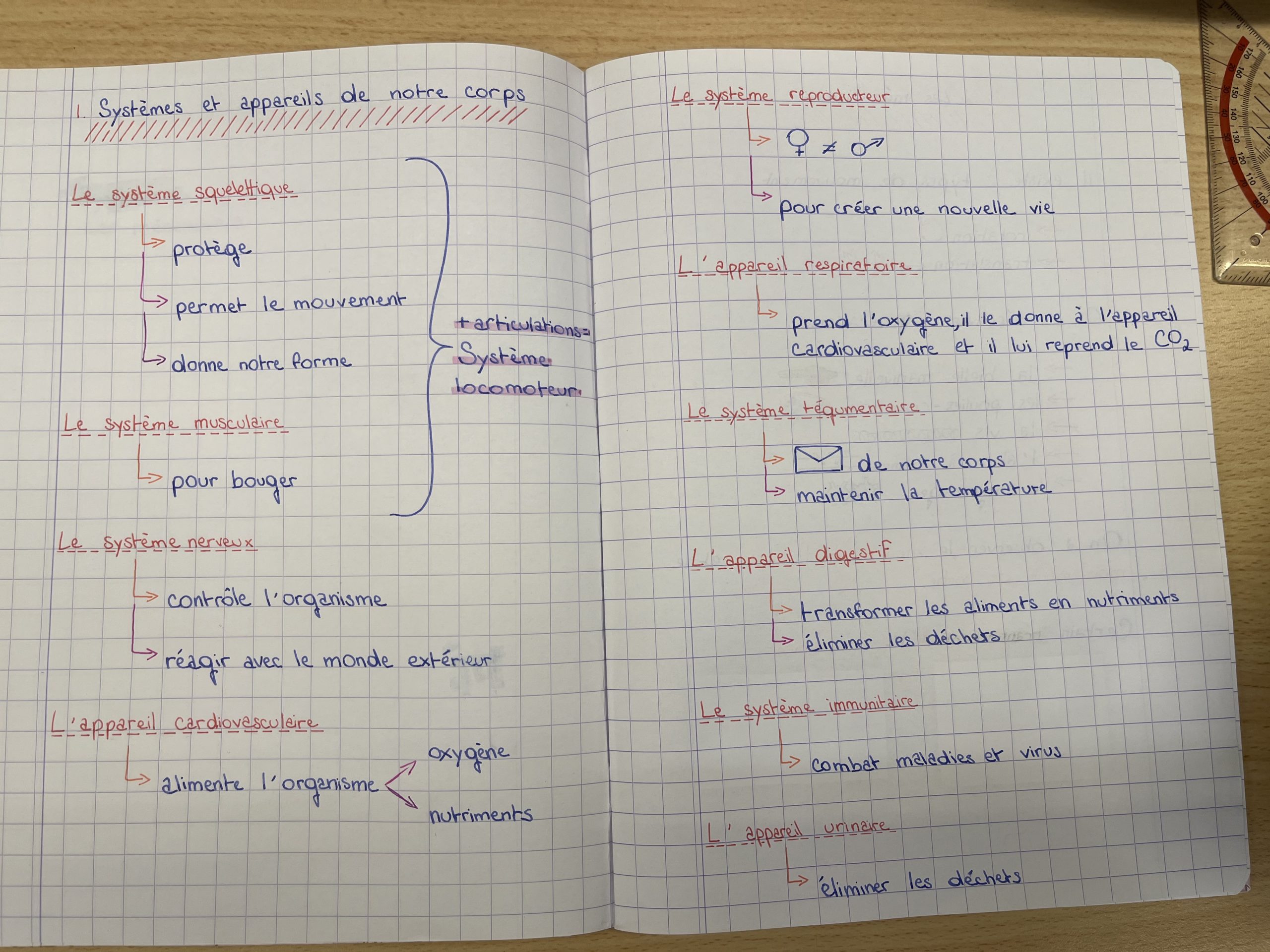 Tu dois connaitre le nom des principaux systèmes et appareils de notre corps, être capable de les reconnaitre sur un schéma, donner leurs rôles principaux.